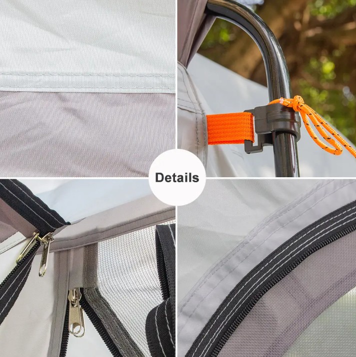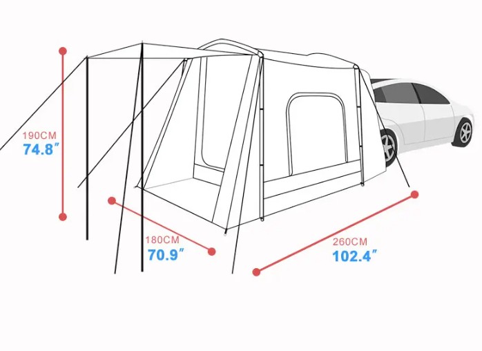 Con un tamaño de 260 x 180 x 190 cm, ofrece un espacio cómodo para 3 a 4 personas, permitiéndote descansar, guardar equipaje o crear un área protegida junto a tu auto.